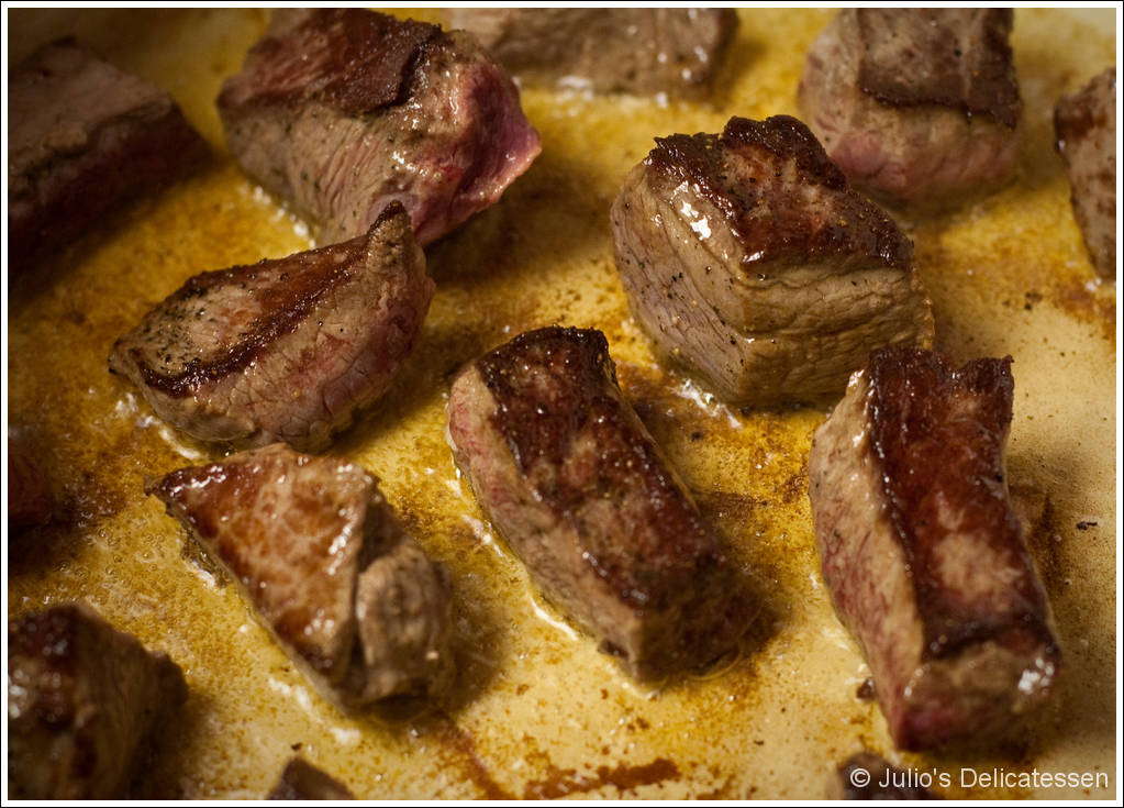 Prep – thinly slice onions. Peel carrots and cut into 1-inch pieces. Thaw demi-glace (if using frozen) or prepare (if you have concentrated demi-glace on-hand). Tie bouquet garni. Chop some flat parsley if you want to use it for garnish. Cut the meat into 1.5 inch pieces.