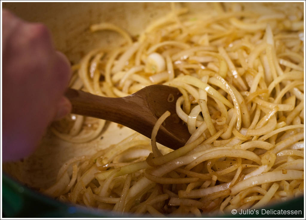 3:05 before mealtime – After the meat has all been browned and is resting on a platter, add the sliced onions to the pan. Sautee until nicely browned (and until there is no more fond on the bottom of the pot because the onions have taken on the color and flavor), about 10 minutes.