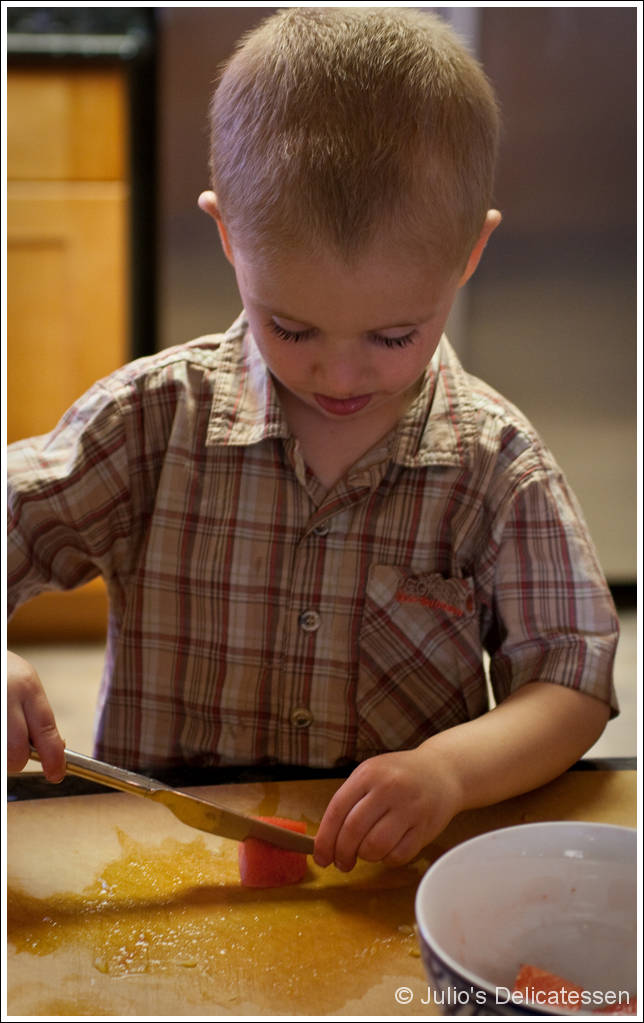 Once the kids got all of the ingredients, I directed them (without touching) to the appropriate knives. I gave them only some basic instructions. (When my 8-year-old got a little confused by the anatomy of a strawberry, I drew a diagram rather than showing her on an actual strawberry so I could stay true to my kids-do-all-the-work policy).