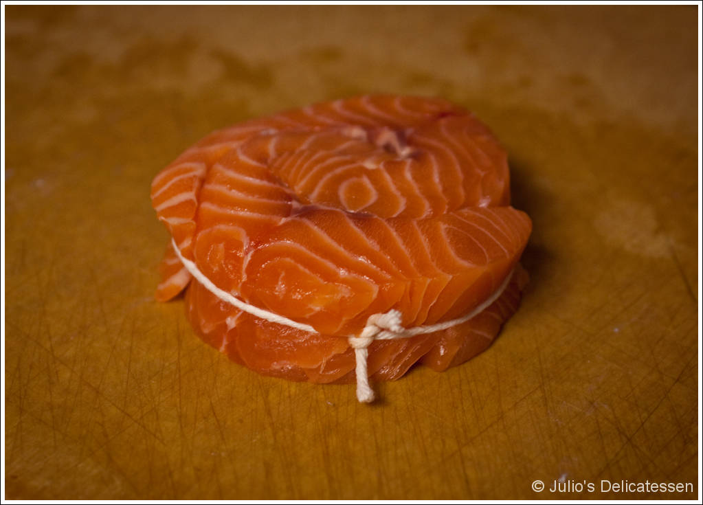 There are times when I find salmon fillets to be a shape or size that’s difficult to deal with; either they’re enormous, or they’re an awkward long-and-skinny shape. This recipe deals with that problem by tying together two small skinless fillets unto a medallion. The quick-pickled red onions really complete this dish, so I recommend giving those a a try.