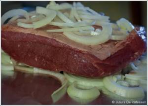 5:45 before mealtime – Preheat oven to 250 degrees. Slice onions. Tightly wrap brisket and onions in foil (ideally in such a way that liquid will pool in the bottom of the foil and not spill out of the pouch).