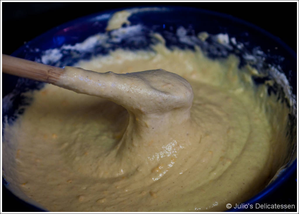 Heat marmalade until bubbling, then strain well. Mix milk and yeast. Let stand 10 minutes, then add 2 whole eggs, granulated sugar, a little more than ¼ cup of the syrup from the marmalade, butter, salt, nutmeg, cinnamon, and orange zest. Mix until well blended, then add 3 cups flour. Mix constantly for 5 – 10 minutes, until dough is smooth and stretchy.