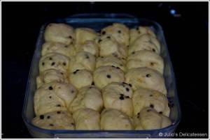 Allow to cool in the pan at least 30 minutes, as much as 24 hours. When ready to eat, mix powdered sugar and fruit juices until smooth. Using a Ziploc bag with one corner cut off, squeeze cross shapes on each bun.