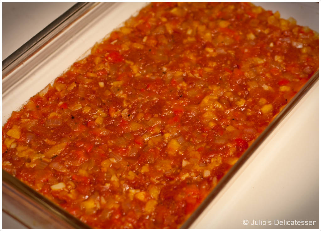 A couple of notes. First, this calls for Japanese eggplant which I’ve always included. I couldn’t find it this weekend, so I just omitted it. If you can find it, definitely use it. Second, I generally use an oval dish so I can spiral the vegetables out from the center. I didn’t have access to one this weekend, so I just went with rows in a rectangular dish.