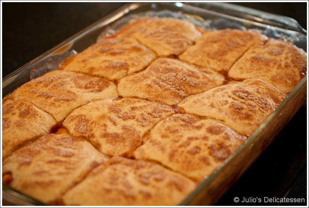 Spoon the topping over the peaches in mounds (leaving space between each one). Liberally sprinkle the topping with the cinnamon sugar.