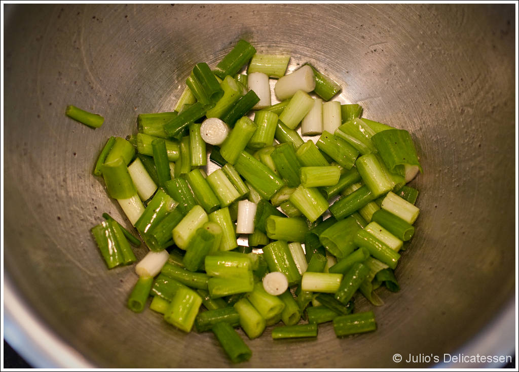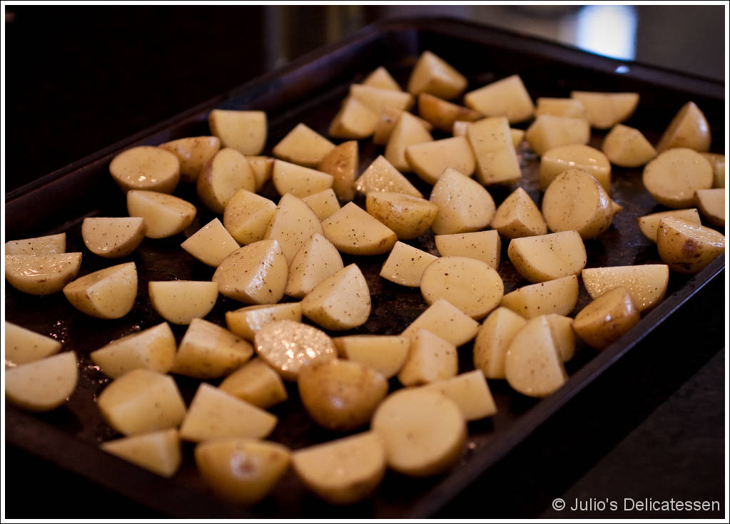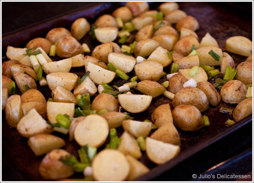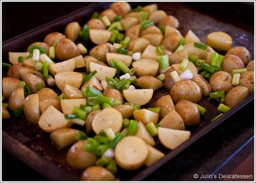 The day you plan to eat, roast the potatoes and green onions. Toss the potatoes with some canola oil, salt, and pepper, and roast in a 375 degree oven for 10 minutes.