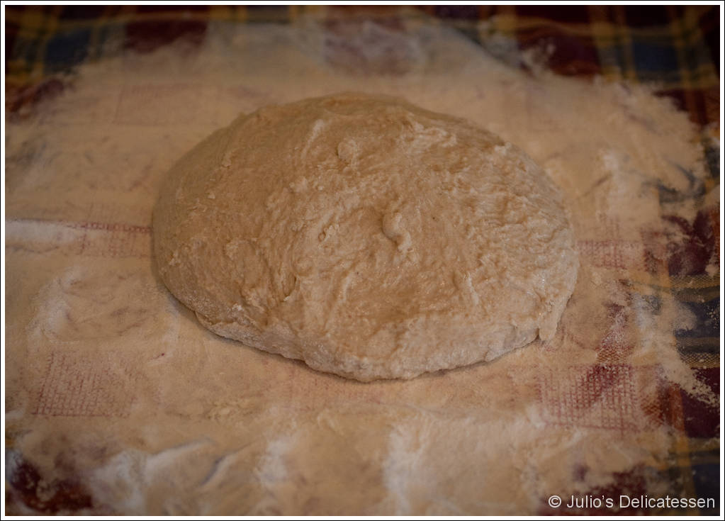 Lightly flour a work surface. Turn the dough out of the bowl onto the work surface. Sprinkle some more flour on top of the dough. Form into a boule. Place on a well-floured cotton towel, seam side down.