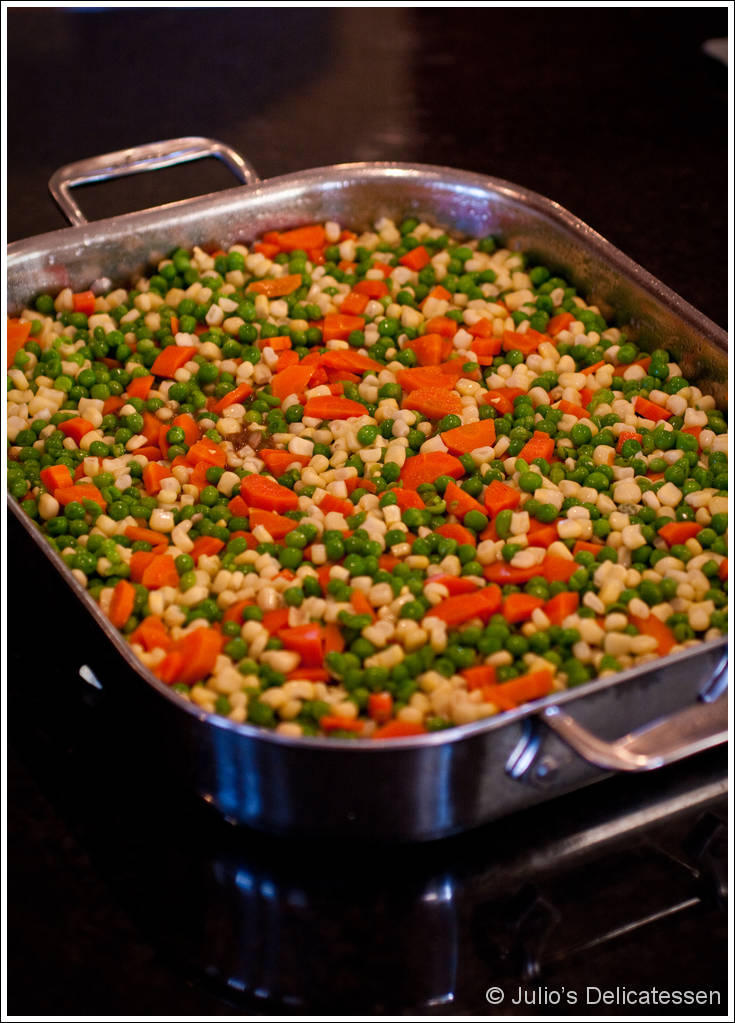 Prepare the vegetable layer – Cook the carrots in salted boiling water for about 4 minutes. Drain, then transfer to a bowl. Add the peas and corn to the bowl and toss. Spread the vegetables evenly over the meat layer.