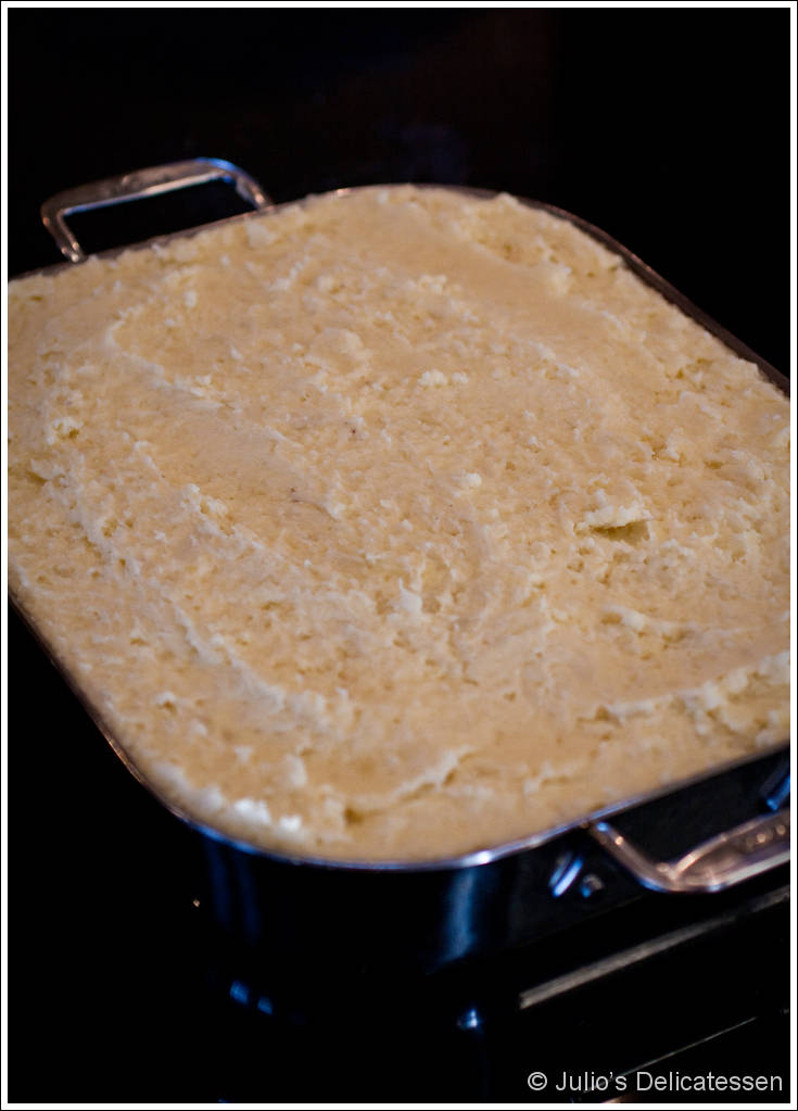 Prepare meat layer – Heat 1 Tb of the olive oil in a large pan over high heat. Add bison meat and sauté until browned throughout – about 5 minutes. Remove cooked bison meat to a bowl. Add the other 1Tb of olive oil, then add the onions, mushrooms, and some salt. Cook for about 7 minutes, then add tomato paste. Cook while stirring until well combined, 1 – 2 minutes. Add thyme and flour, and stir to combine. Add wine, broth, and bison and bring to a simmer. Reduce heat and simmer until sauce thickens, 12 – 15 minutes. Season with salt and pepper. Remove from heat and scrape into a buttered baking dish (10 x 15 will work better than 9 x 14).