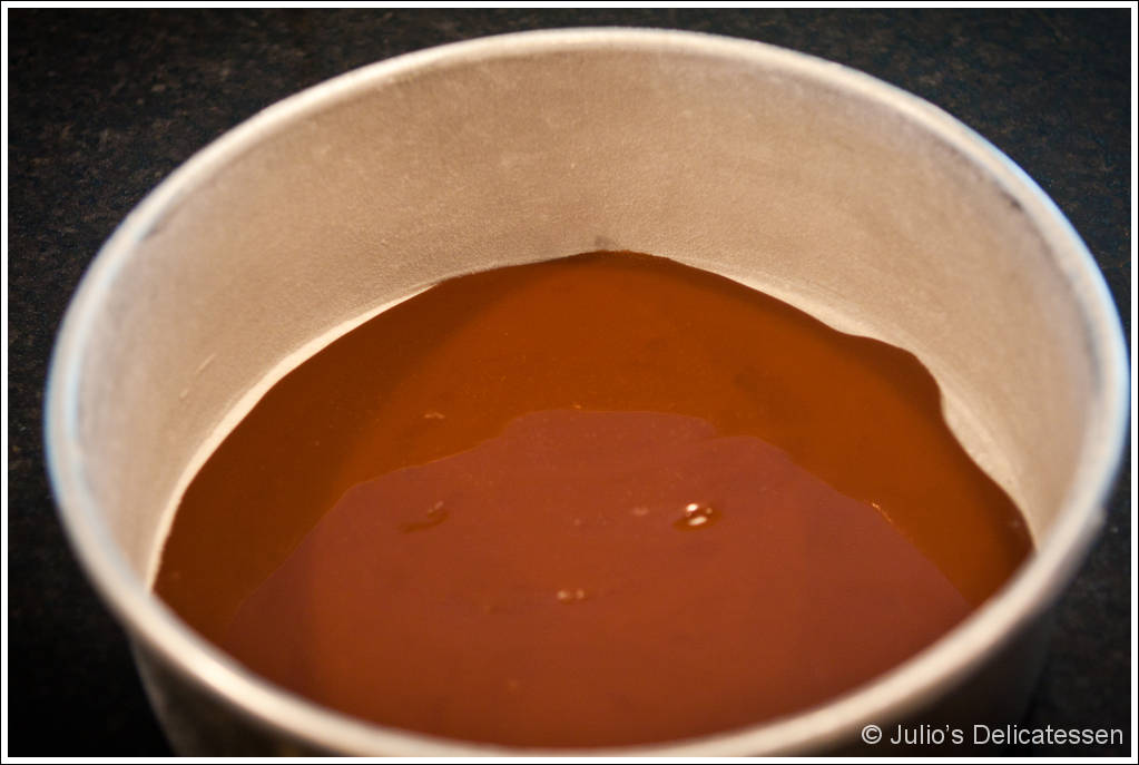 Preheat oven to 350 degrees. Butter the bottom and sides of a 10” cake pan with sides at least 3 inches tall. Coat evenly with a light dusting of flour. Pour the cajeta evenly over the bottom of the pan, covering it completely.