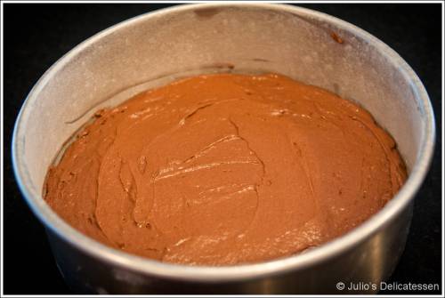 Finish the cake – Scrape the cake batter into the pan, carefully spreading it over the cajeta. Smooth the top.
