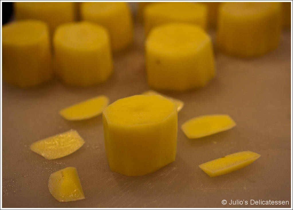 Peel the potatoes, then use a knife to carve them into cylinders. They need to have a flat top and bottom and be short enough to fit completely inside a covered skillet. Cutting the sides to be perpendicular to the top and bottom is a nice touch but not necessary.