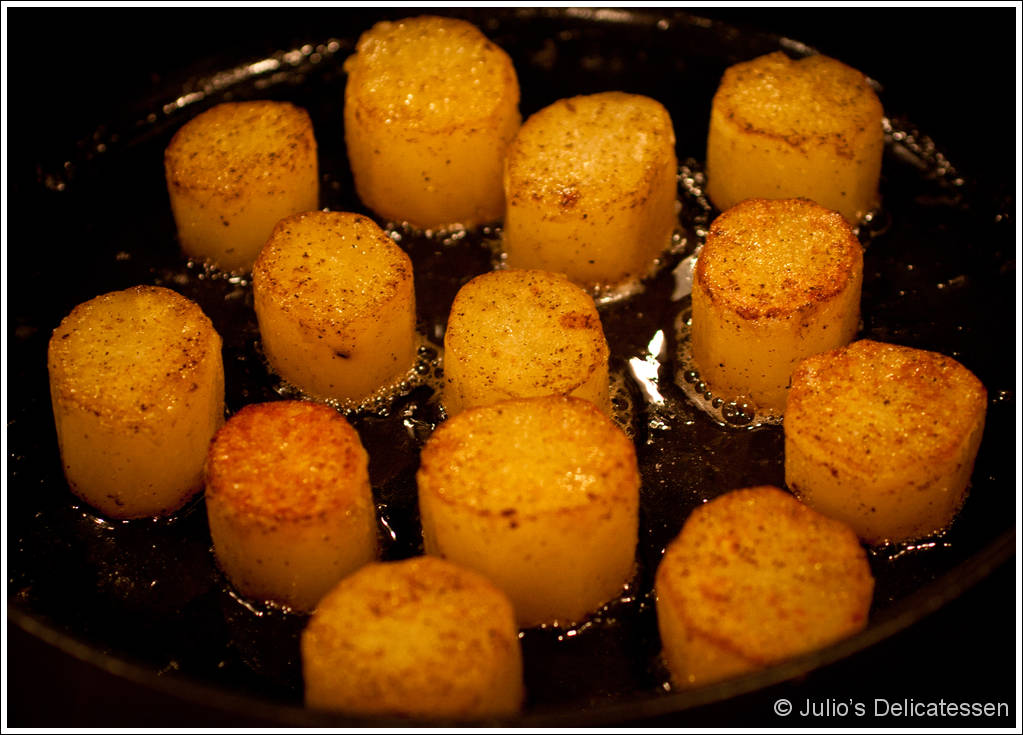 My friend Tim sent me a link to this recipe a few weeks ago. As it turns out, it may be the perfect potato recipe. Cooking over very low heat with a lid on the pan allows the potatoes to both brown and steam in butter at the same time, leading to perfectly creamy interiors with slightly crispy exteriors. As you can see in the picture from the previous post, I served these with poulet en cocotte. That recipe yields a small amount of pan sauce which worked very well with these potatoes. I expect this recipe to become a standard in our house.