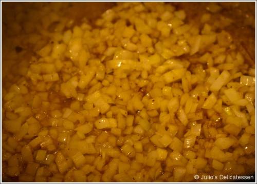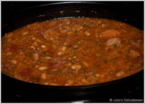 Remove from heat and stir in tomato paste and stock. Stir until well combined. At this point, either scrape the mixture into the slow cooker or – if you’ve been working with a stovetop-safe insert, add to it the pork, bacon, beans, chorizo, and garlic.