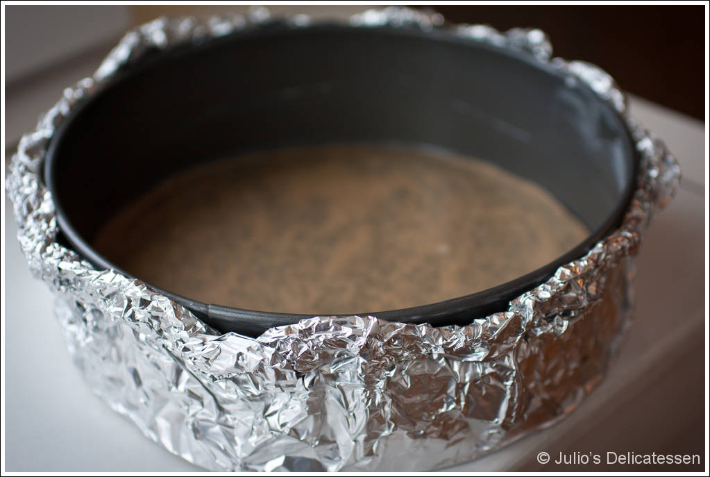 Adjust an oven rack to the lower-middle position. Preheat oven to 325 degrees. Grease and 8-inch springform pan and line the bottom with parchment paper. Wrap the outside of the pan with two 18-inch square pieces of heavy-duty aluminum foil.