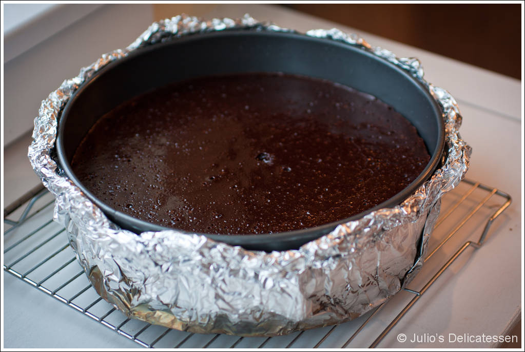 Scrape the batter into the prepared pan and smooth the surface. Set the roasting pan with the springform pan on the oven rack and add enough boiling water to the roasting pan to come halfway up the outside of the foil-wrapped springform pan.