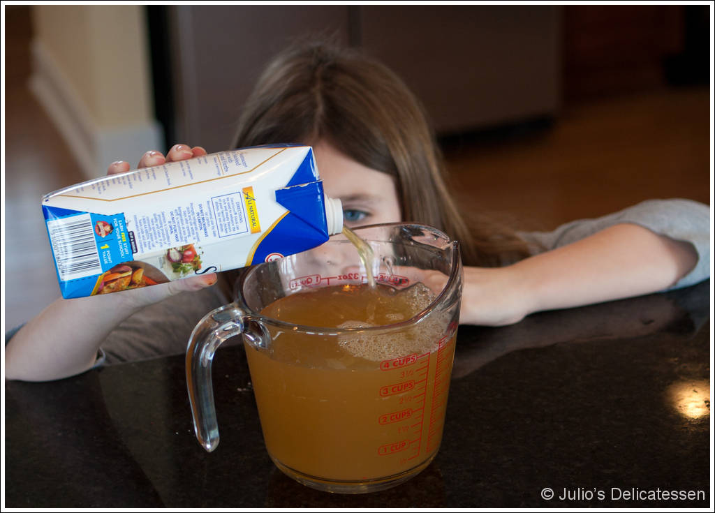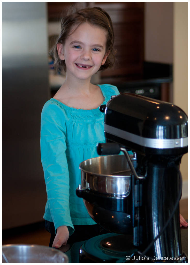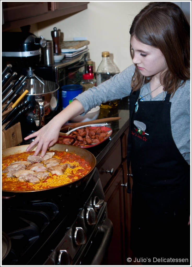 Back to the paella. When it came to preparing the dish, there were only two steps where I helped: adding the first pieces of chicken to the hot olive oil (while my daughter got comfortable with the splattering oil) and moving the pan into and out of the oven. Otherwise, this dinner for eight was cooked entirely by a nine-year-old.