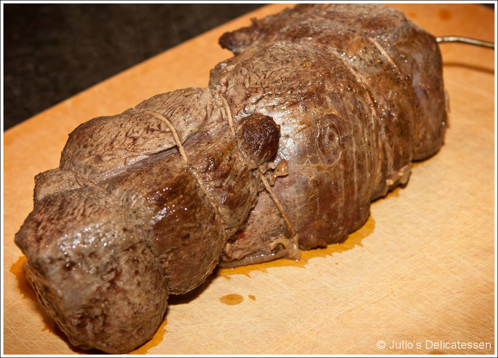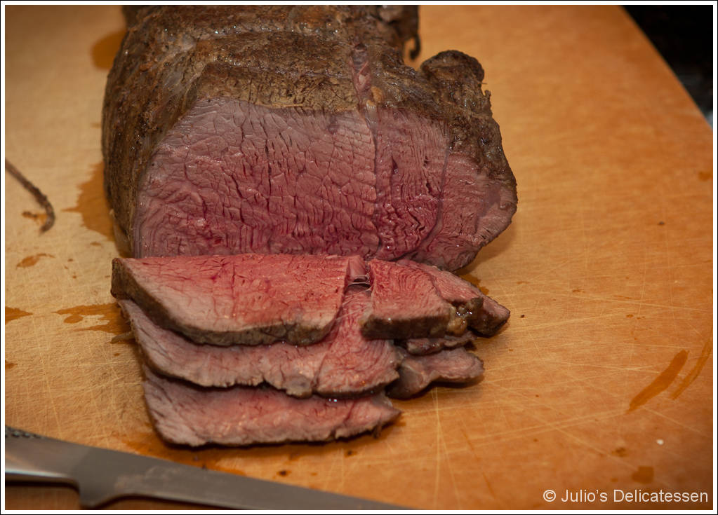 When ready to serve (after the meat has rested at least 20 minutes), remove the twine and slice into 1/4-inch thick slices.