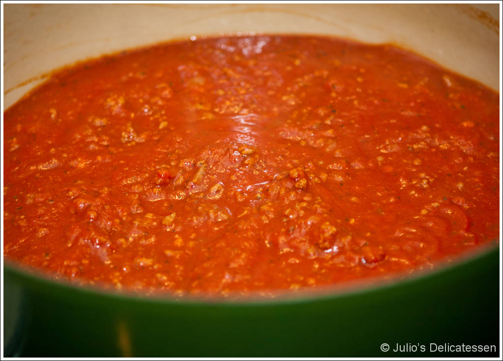 Make the sauce: In a large pot or Dutch oven, brown the sausage, beef, onion, and garlic. Pour off any excess fat. While the meat is browning, combine the tomato paste with the water. Once the meat is browned, add the tomato paste/water, the crushed tomatoes, the tomato sauce, the dried herbs, and salt and pepper. Stir to combine. Simmer over low heat for at least an hour, ideally a couple of hours. (You will likely end up with slightly more sauce than you need; it freezes well.)