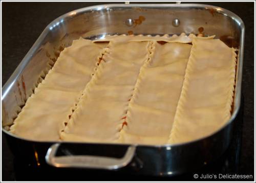 When the sauce is done, you’re ready to assemble the lasagna. Preheat the oven to 350 before you start. Start by adding some sauce to the bottom of the pan. Top with a layer of noodles.