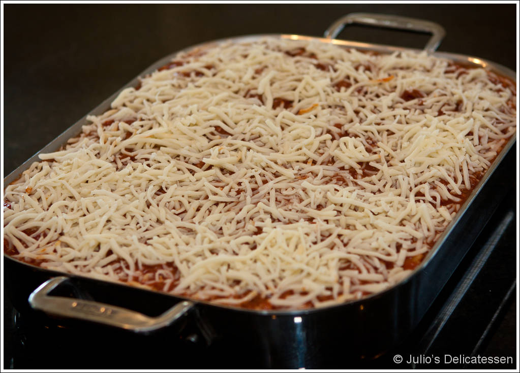 Sprinkle with mozzarella, then with parmesan. Add two more layers of sauce, noodles, ricotta mixture, mozzarella, and parmesan. After you’ve built three layers, add some sauce to the top, then sprinkle with mozzarella.