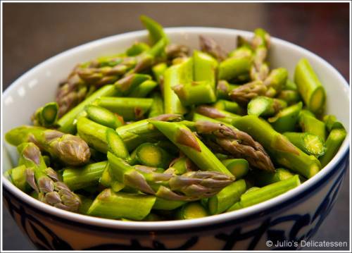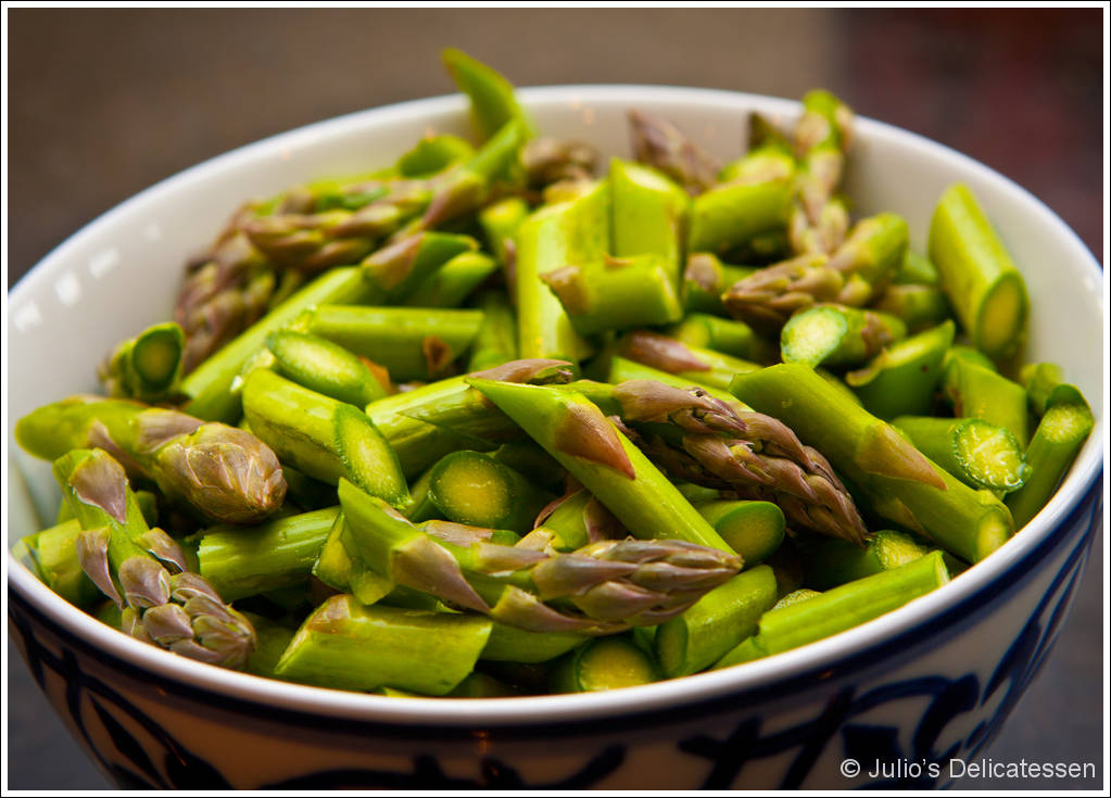 - 1 lb asparagus, tough ends removed and chopped; remainder sliced into ½ inch pieces