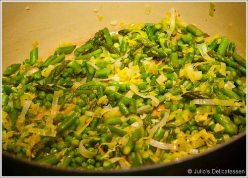 28 minutes before you want to eat – prep the vegetables – heat 2 Tb of the oil in a dutch oven over medium heat. Add the sliced leeks and some salt. Cook for about 5 minutes, stirring occasionally. Add the asparagus to the pot and cook for another 4 minutes. Add the remaining garlic and the pepper flakes and cook for about a minute. Add the peas and cook for another minute.
