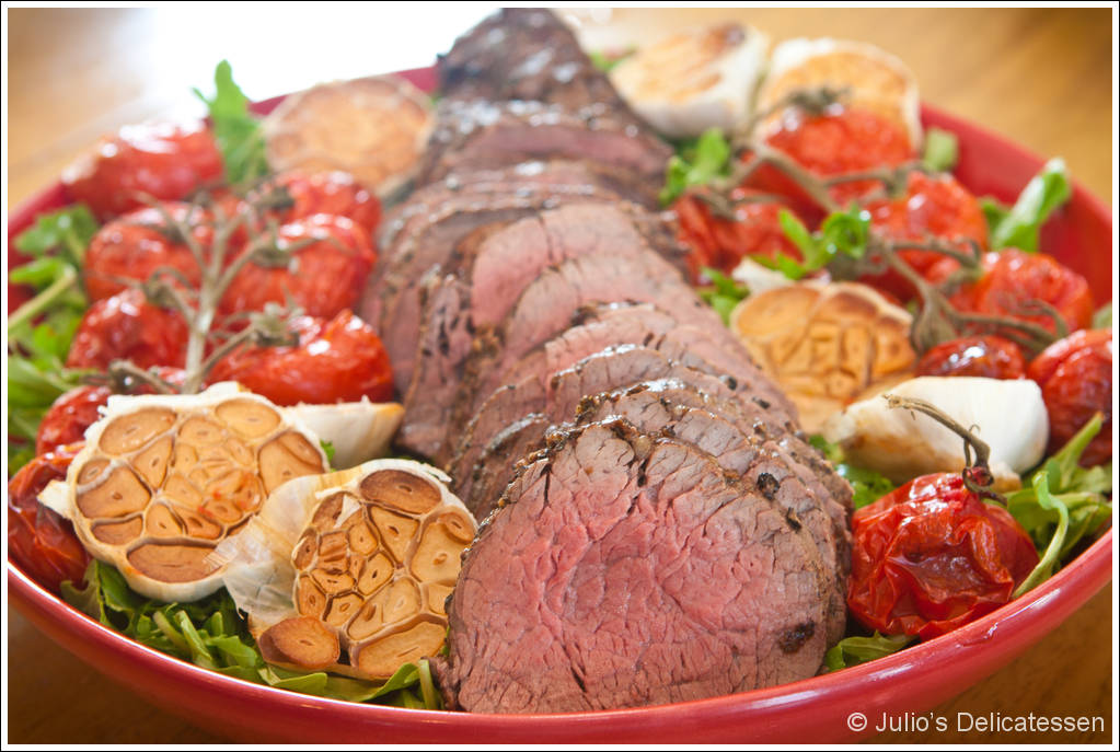 5 minutes before you want to eat – Carve the meat into thin slices. Place on top of the arugula. Add the roasted garlic and tomatoes to the platter with the beef. Garnish with shaved parmesan.