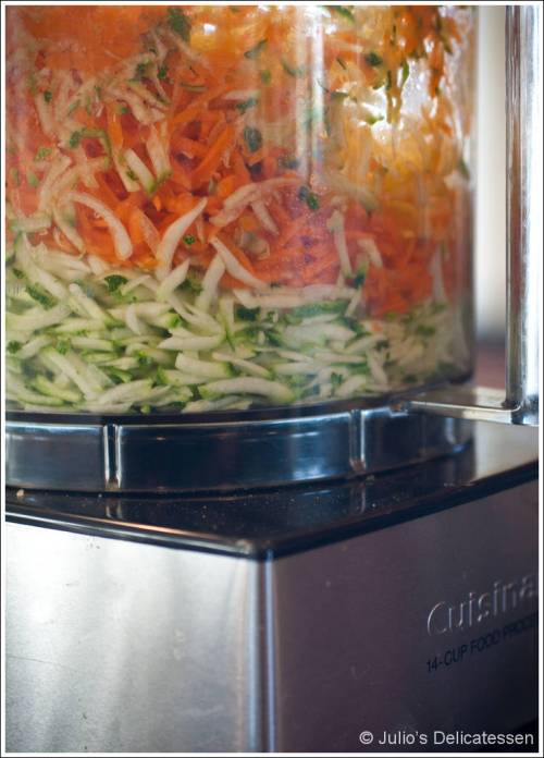 Peel and grate all of the vegetables (except the scallions – chop those by hand) in a food processor with a grating blade attached.