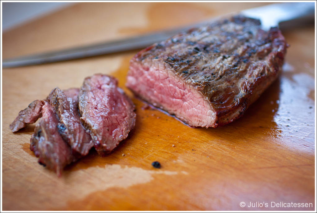 Light your grill and allow it to get nice and hot. Allow the steaks to come to room remperature for at least 30 minutes. Dry both sides with paper towels and season with kosher salt and pepper. Grill for about 2 minutes per side for medium rare. Remove from grill, cover with aluminum foil, and allow to rest for 5 – 10 minutes. Slice thinly across the grain and serve with the salsa verde.