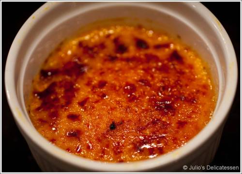 Use a whisk to combine all of the ingredients. Spoon into small ramekins or a crème brulee dish. Sprinkle some sugar (brown or granulated) over the top. Using a handheld torch or your broiler, heat the sugar until it caramelizes. Serve immediately.