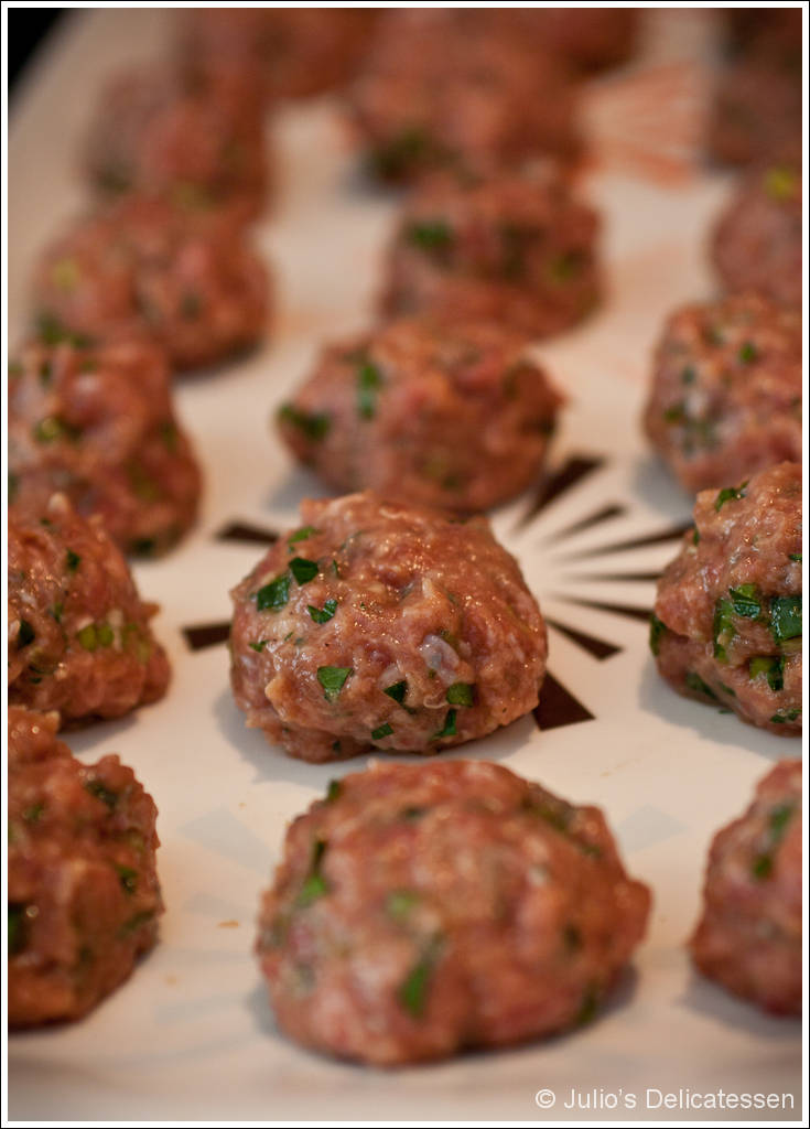 Form the meatballs – combine all ingredients in a bowl and use a fork to thoroughly combine. Form meatballs (using roughly 1 Tb of the mixture for each one) and set aside.