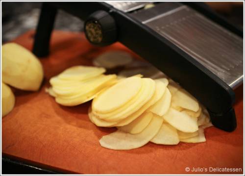 Peel the apples, cut them in half and remove the core from each half. Using a mandoline, cut the apples into 1/16” slices.