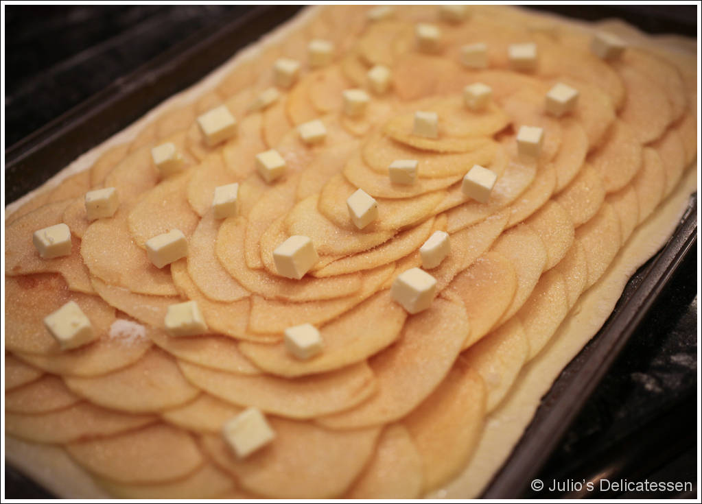 Leave a ½ inch border around the edge and lay the slices in a rectangle, each overlapping the previous one. Continue laying the apple slices in overlapping, concentric rectangles until you have used all of the apples and the tart is covered. Sprinkle the apples with the 2 Tb of sugar and dot with the 2 Tb of butter cut into small pieces.