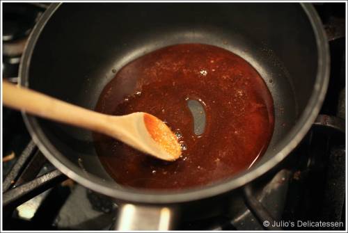 About 20 minutes into the baking time, make the caramel glaze. Place the ¼ cup of granulated sugar in a small saucepan over medium-high heat. As soon as the sugar melts (~3 minutes), swirl the pan or stir until it darkens to a light brown.