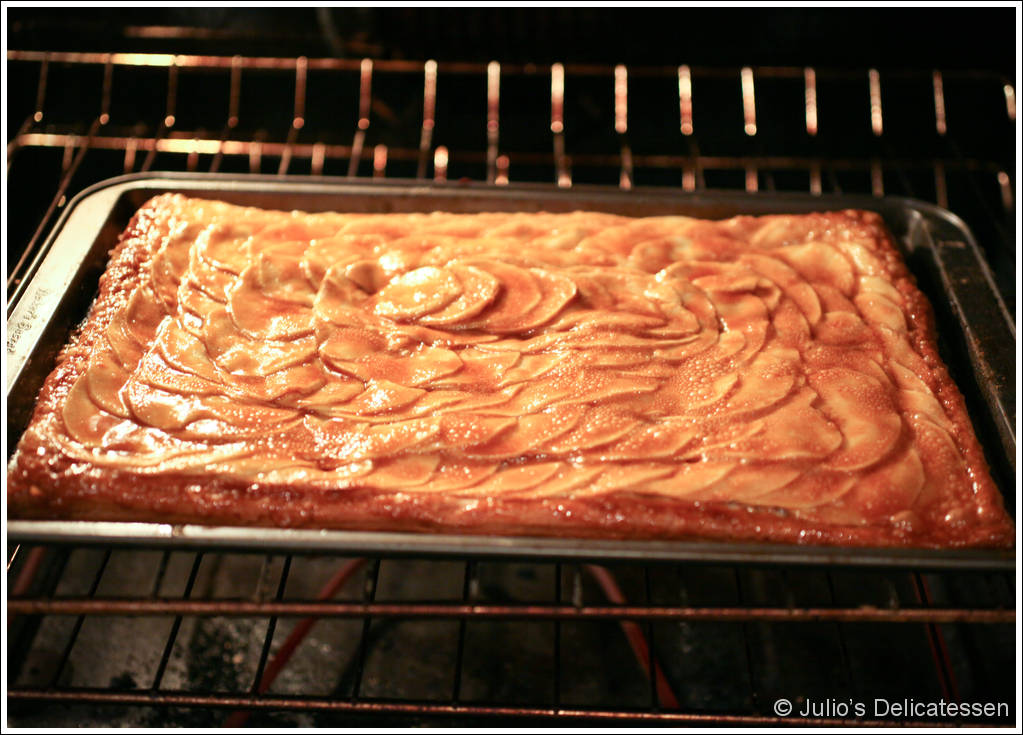 Remove the tart from the oven and gently brush the whole thing (apples as well as the edge where the pastry is uncovered) with the glaze. Return to the oven for 5 – 7 minutes or until the glaze starts to bubble.