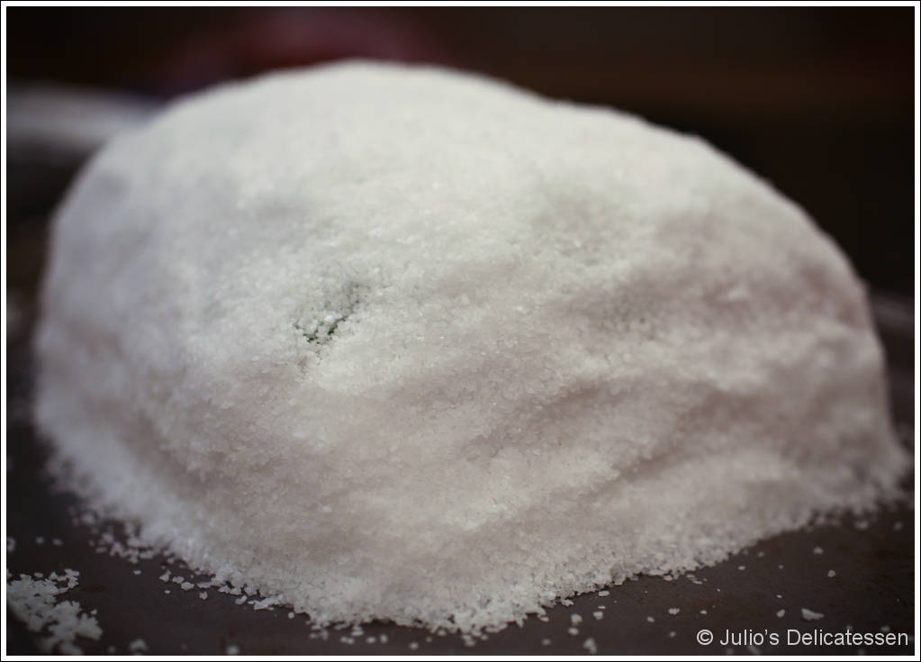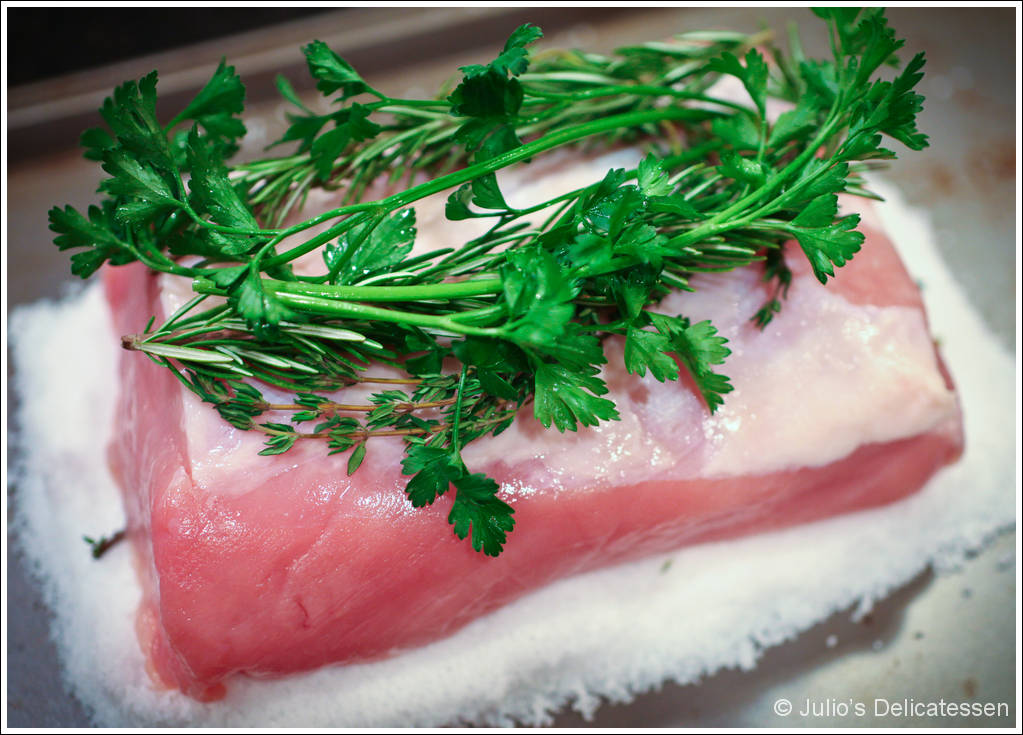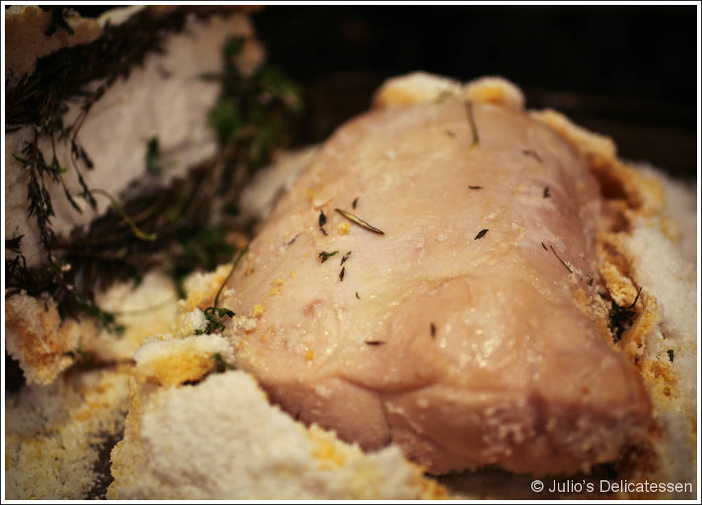 Place the remaining herbs on top of the pork. Carefully and tightly pack the salt around the pork and herbs.