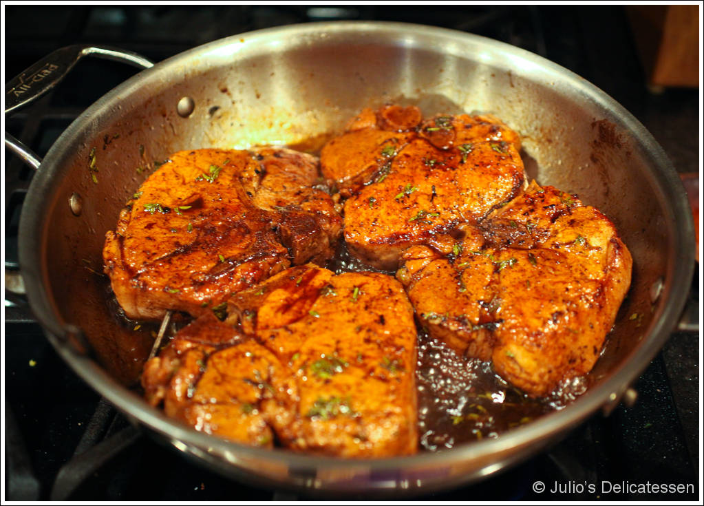 Uncover, flip the chops, and continue cooking until the internal temperature reaches 145 degrees – about 10 more minutes. Remove the chops and allow to rest while you finish the sauce. Turn the heat up to medium high and simmer until the sauce is thick and syrupy. Remove the pan from the heat, stir in the butter, and serve with the chops.