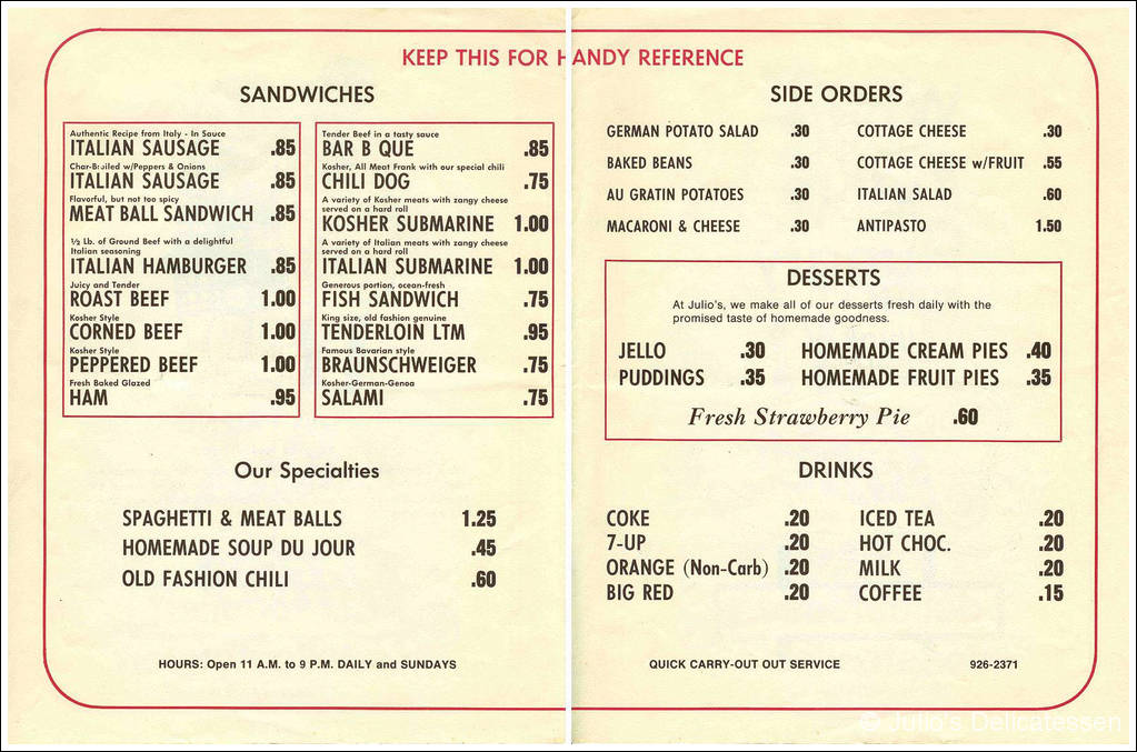 My mom recently found an old menu from the original Julio’s Delicatessen. Tell a friend about the great food at Julio’s.