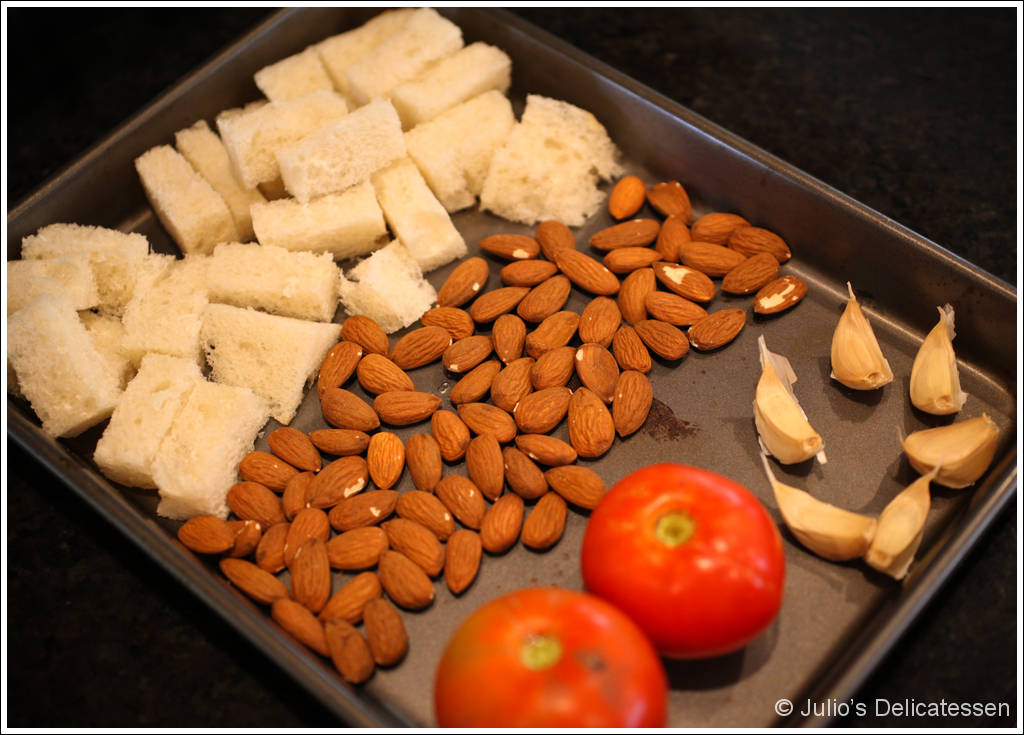Preheat oven to 375 degrees. Place the tomato, garlic, bread, and almonds on a baking sheet and place in oven.