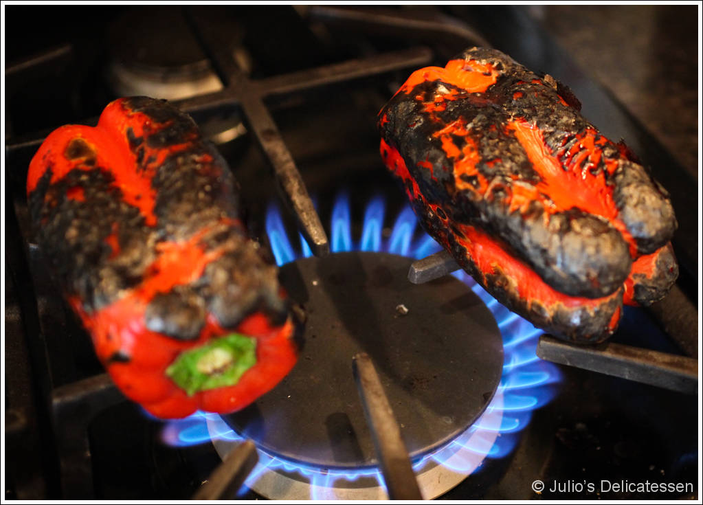 While the tomato and garlic are roasting, roast the peppers over an open flame on a gas stove.