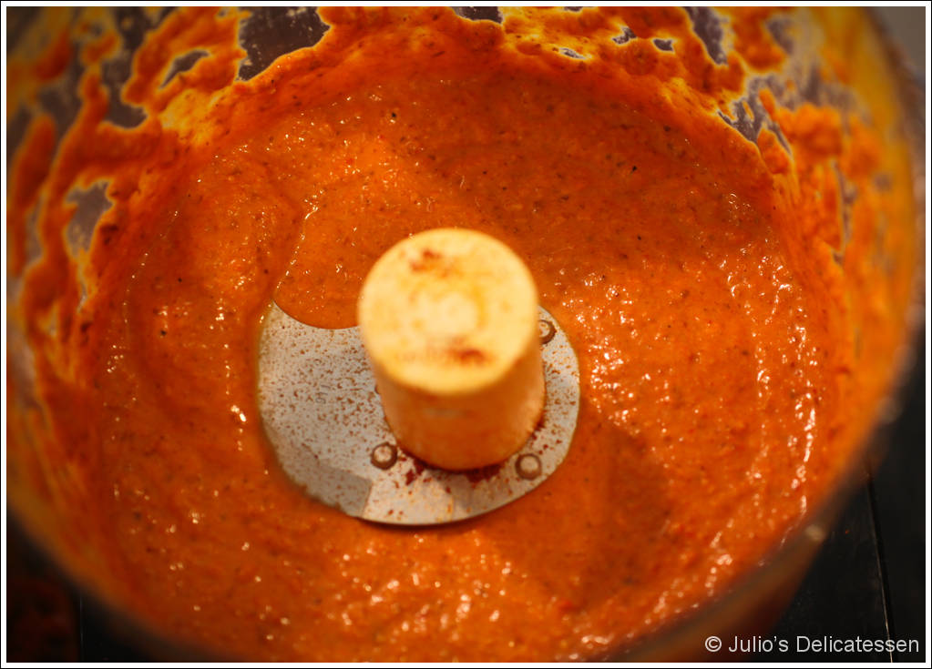 Romesco is a classic Spanish sauce made with almonds, garlic, peppers, and any number of other ingredients. It is easy to make, stores well, goes with a wide variety of items, and is surprisingly good for you. This weekend I served it with grilled beef tenderloin and scallop skewers, but it would also go well with grilled vegetables, chicken, etc.