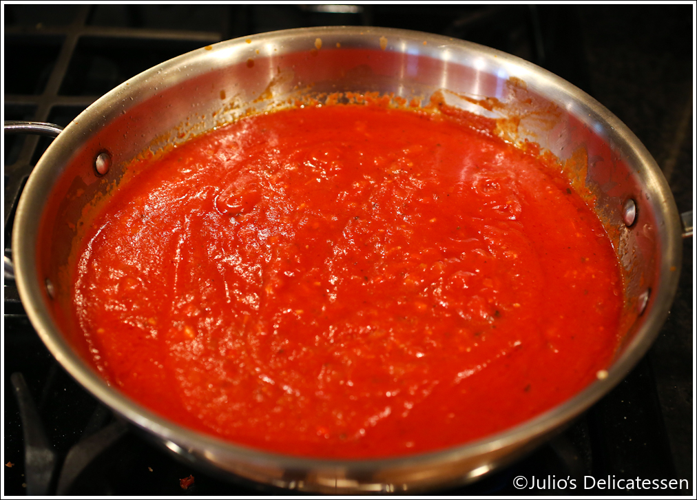 Add garlic and cook another minute or two. Add tomato sauce, crushed red pepper, salt, and black pepper. Stir to combine. Cook for 5 – 10 minutes until sauce is simmering.