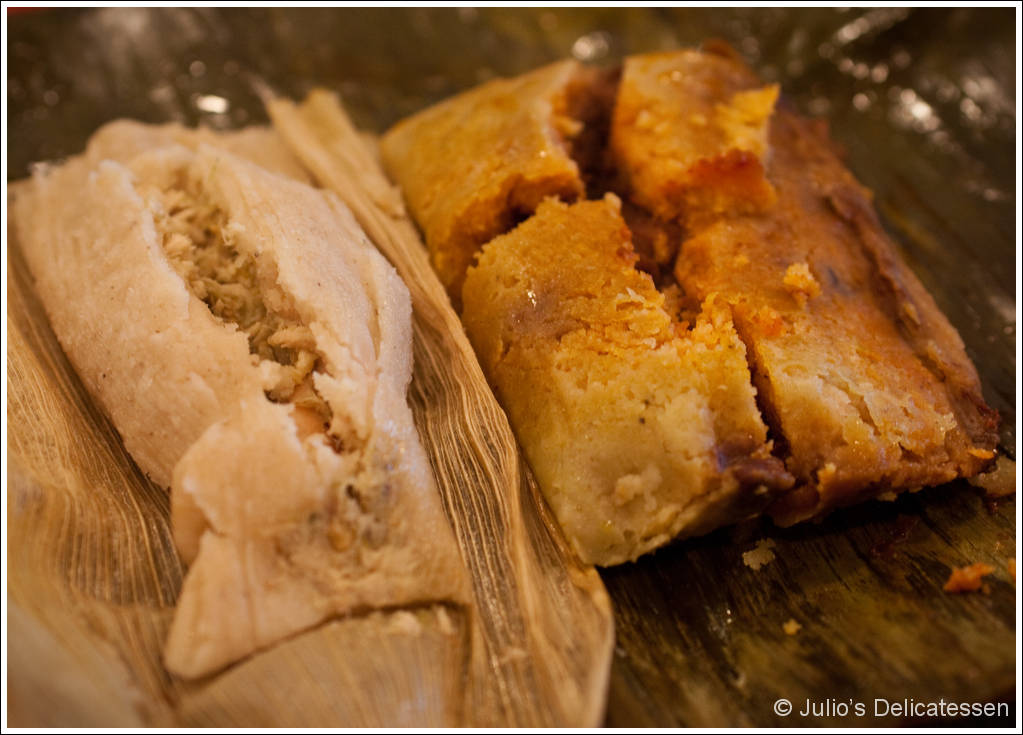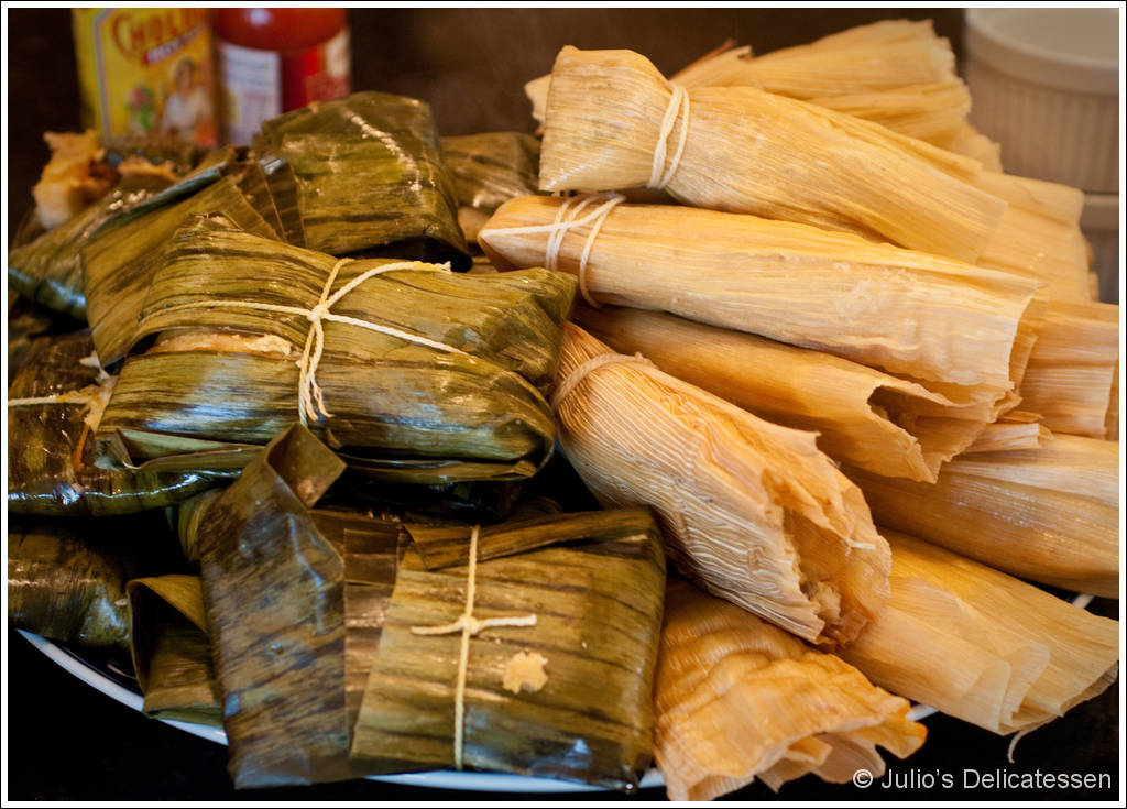 This weekend, I wanted to make a big batch of tamales to entertain a large group (and as an excuse to use the new tamalera I just bought). There are two common wrappers for tamales – dried corn husks and banana leaves. Since I was making two different varieties, I used both types of wrapper to make it easy to distinguish between them. A huge pot of steamed tamales – along with a big pot of borracho beans (or charro beans) and some rice – what could be better?