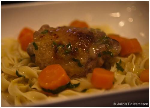 This dish requires a relatively large Dutch oven, and I’ve been meaning to make it since I bought one a couple of years ago. This recipe is essentially the one that Julia Child included in Mastering the Art of French Cooking, though the addition of foil in combination with the lid (which enables the chicken very moist despite the long, slow cooking time) was a twist introduced by the folks at America’s Test Kitchen, so that’s what I’ve linked to below.