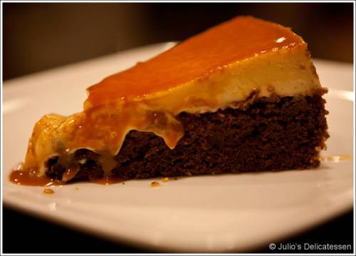 This dessert is also known as pastel imposible – impossible cake. As you can see below, the cake batter and the flan switch places in the oven. My oldest daughter requested this as the birthday cake for her 9th birthday party, capping an all-Rick-Bayless menu of tequila-infused queso fundido, guacamole, fajitas made with grilled chicken and chipotle flank steak, fried black beans, chorizo, and Mexican red rice – all made using Rick Bayless recipes.