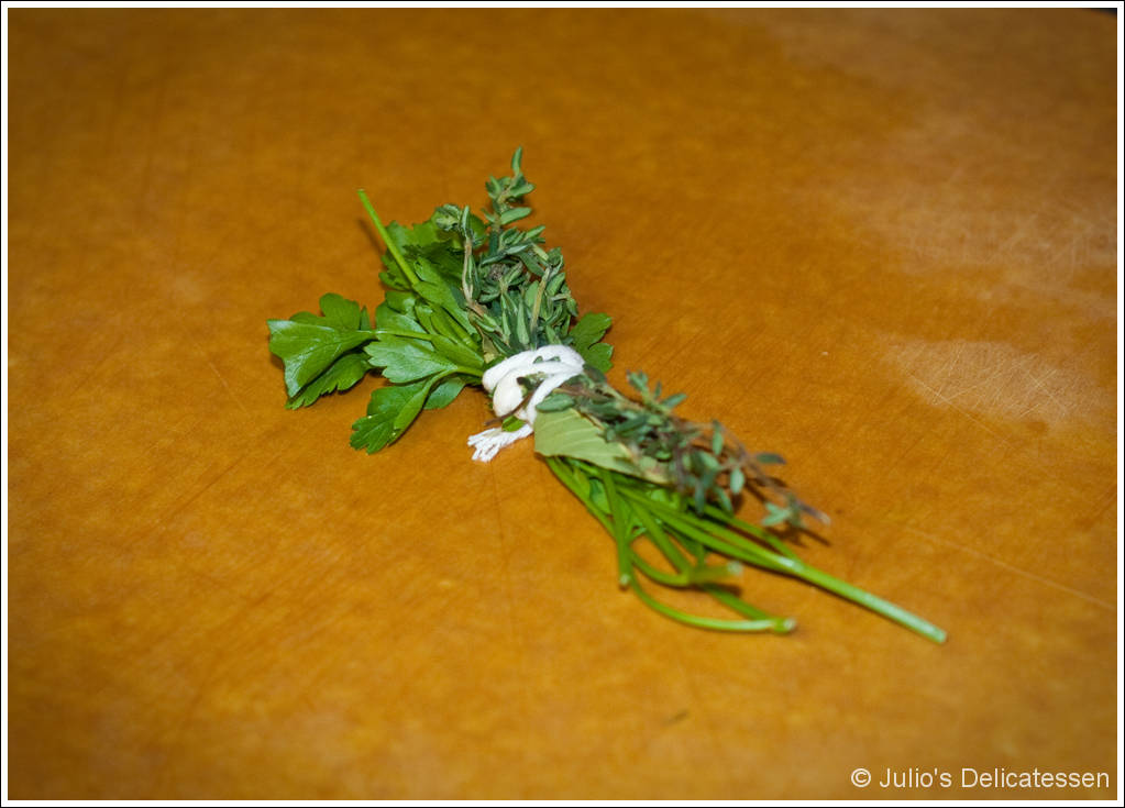 A bouquet garni is flat parsley, bay leaf, and thyme tied together with twine or wrapped in cheesecloth. It’s great for flavoring soups, stews, and sauces. Don’t forget to remove it before you serve.